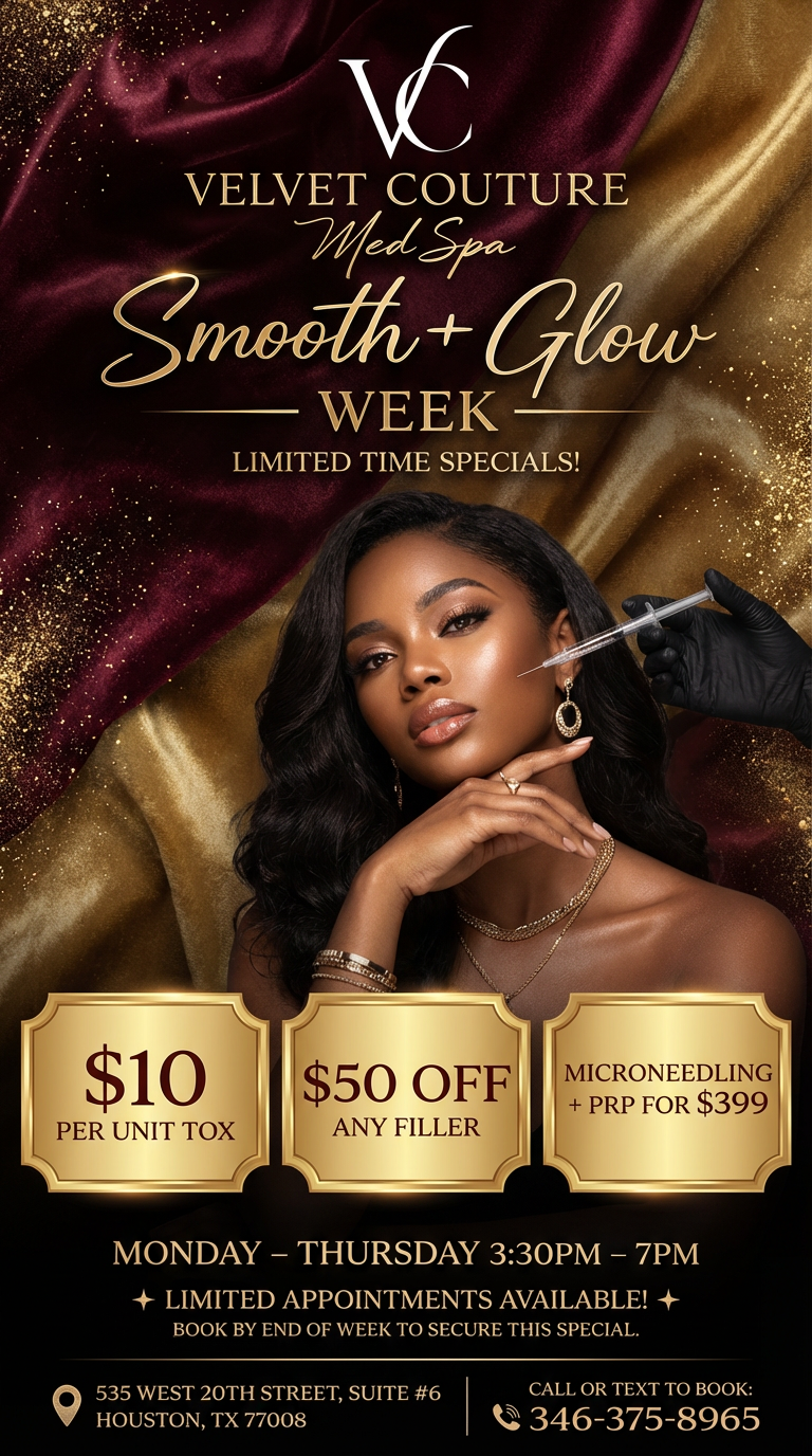 At Velvet Couture Medspa, our events and exclusive offers are released in limited drops and often book quickly. To be the first to know about upcoming Botox Happy Hours, VIP events, and signature experiences: